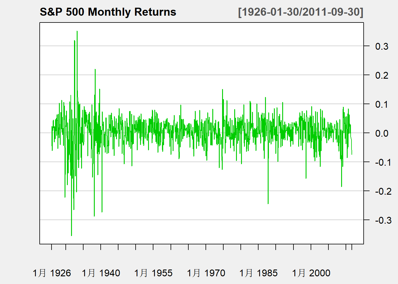 标普500月收益率, 收益率在0上下波动,除了个别时候基本在某个波动范围之内。