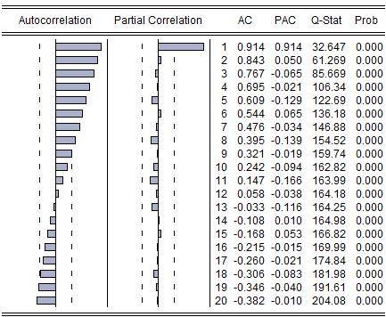 自相关系数(Autocorrelation, AC)、偏相关系数(Partial Correlation, PAC)、Q统计量(Q-Stat)、伴随概率(Prob)